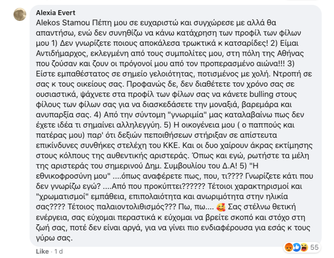 «Η κα Αλεξία Έβερτ είναι μία αληθινή Κυρία με μεγάλη προσφορά στην Αθήνα μας. Προφανώς η οργή των ημερών και η χαλαρότητα του Διαδικτύου την οδήγησαν σε μια απρεπή έκφραση καταδίκης μίας προκλητικής πράξεως του ΚΚΕ. Δεν πρέπει να φύγει από το Δημοτικό Συμβούλιο. ”Ο αναμάρτητος…”» έγραψε σε ανάρτησή του ο υπουργός Ανάπτυξης, Άδωνις Γεωργιάδης την Πέμπτη, ακολουθώντας τα βήματα του Θάνου Πλεύρη, που από την προηγούμενη ημέρα είχε χαρακτηρίσει ως «άστοχη» την αντικομμουνιστική ανάρτηση της Αλεξίας Έβερτ.