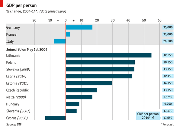 Αντίθετα, σύμφωνα με το Economist, υπάρχουν τέσσερις ξεκάθαρα κερδισμένες σε επίπεδο ευημερίας χώρες, που είναι οι δύο χώρες της Βαλτικής, Λιθουανία και Λετονία, μαζί με τις Πολωνία και Σλοβακία, οι οποίες έχουν βγει κερδισμένες καθώς το κατά κεφαλήν ΑΕΠ τους αυξήθηκε πάνω από 40%.