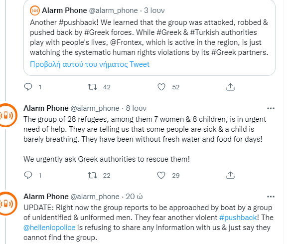 Η ομάδα των 28 προσφύγων είχε ξαναβρεθεί σε ελληνικό έδαφος, αλλά επαναπροωθήθηκε στην Τουρκία στις αρχές Ιουνίου από τις ελληνικές αρχές, που πρώτα τους επιτέθηκαν και τους πήραν τα υπάρχοντά τους. «Την ώρα που οι ελληνικές και οι τουρκικές αρχές παίζουν με τις ζωές των ανθρώπων, η Frontex, που δραστηριοποιείται στην περιοχή, το μόνο που κάνει είναι να παρακολουθεί τις παραβιάσεις ανθρωπίνων δικαιωμάτων εκ μέρους των ελληνικών αρχών», σημειώνει το Alarm Phone, υπογραμμίζοντας πως η ομάδα των προσφύγων δεν έχει ούτε νερό και φαγητό.