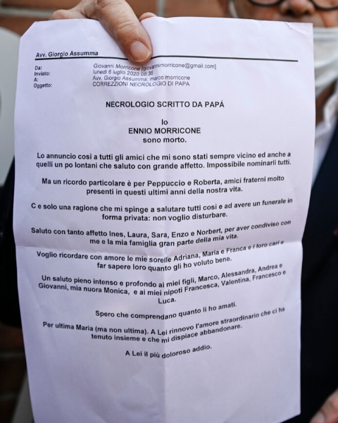Έναν συγκινητικό αποχαιρετισμό στους αγαπημένους του άφησε, με εντολή να δημοσιευτεί μετά το θάνατό του, ο θρυλικός μαέστρος, Έννιο Μορρικόνε, που έφυγε εχθές από τη ζωή σε ηλικία 91 ετών. Το κείμενο δημοσίευσαν όλες οι ιταλικές εφημερίδες. χαρακτηριστικός ήταν ο τίτλος της Κοριέρε ντε λα Σέρα, «Τον επικήδειό του έγραψε ο ίδιος οΈννιο Μορικόνε».