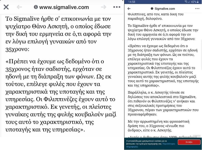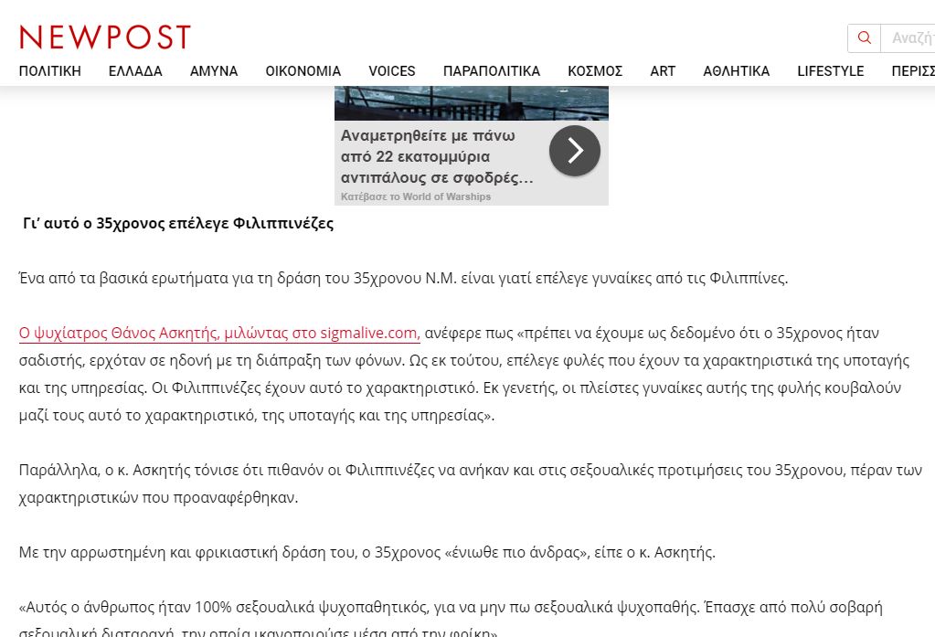 Μάλιστα, πριν ξεσπάσει ντόρος για τις δηλώσεις του υποψήφιου του ΚΙΝΑΛ, τουλάχιστον μία ιστοσελίδα στην Ελλάδα (newpost.gr) είχε ήδη μεταφέρει τις δηλώσεις, με τον τίτλο «Γιατί ο serial killer επέλεγε Φιλιππινέζες», χωρίς να προκληθεί καμία αντίδραση: