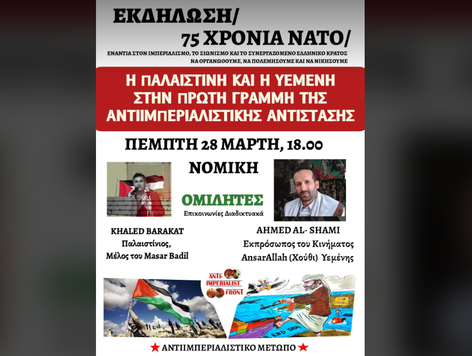«Το Αντιιμπεριαλιστικό Μέτωπο διοργανώνει στην Αθήνα, την Πέμπτη, 28 Μαρτίου, εκδήλωση ενάντια στα 75 χρόνια ΝΑΤΟ, στο πλαίσιο διεθνούς καμπάνιας, με θέμα “Η Παλαιστίνη και η Υεμένη στην πρώτη γραμμή της αντιιμπεριαλιστικής αντίστασης”. Ως αντιιμπεριαλιστές, διεθνιστές, αγωνιστές/τριες έχουμε χρέος να στηρίξουμε με όλους τους τρόπους την ηρωική αντίσταση των λαών σε Παλαιστίνη και Υεμένη και να αγωνιστούμε σε ενιαίο μέτωπο ενάντια στον κοινό μας εχθρό, τον ιμπεριαλισμό ΗΠΑ-ΕΕ-ΝΑΤΟ, το σιωνιστικό κράτος δολοφόνο του Ισραήλ και το συνεργαζόμενο ελληνικό κράτος. Το ελληνικό κράτος στο πλαίσιο της πολιτικής ΝΑΤΟ-ΕΕ, συμβάλει στη γενοκτονία των Παλαιστινίων και επιτίθεται ξεκάθαρα και στο λαό και της Υεμένης. Στέλνει φρεγάτες (ΥΔΡΑ) στην Ερυθρά Θάλασσα, μετατρέπει το στρατηγείο της Λάρισας σε κέντρο επιχειρήσεων της ΕΕ κατά του λαού της Υεμένης και της Αντίστασής του. Η Αντίσταση της Παλαιστίνης και της Υεμένης αποτελούν φωτεινό σηματοδότη για όλα τα αντιιμπεριαλιστικά κινήματα και τους καταπιεσμένους λαούς του κόσμου, γιατί αποδεικνύουν καθημερινά ότι ο ιμπεριαλισμός και ο σιωνισμός είναι “χάρτινοι τίγρεις”, μπορούν να χτυπηθούν και να ηττηθούν από λαούς με αυτοθυσία που δεν έχουν πραγματικά να χάσουν τίποτα πέραν από τις αλυσίδες τους.