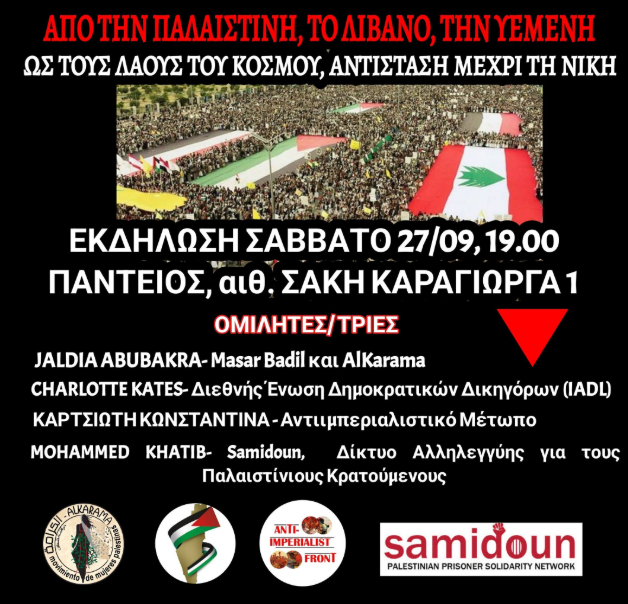«ΕΚΔΗΛΩΣΗ: Από την Παλαιστίνη, το Λίβανο και την Υεμένη ως τους λαούς του κόσμου: Αντίσταση μέχρι τη νίκη! Σάββατο, 27 Σεπτεμβρίου 2025,19.00, ΠΑΝΤΕΙΟ ΠΑΝΕΠΙΣΤΗΜΙΟ, Αθήνα, αίθουσα Σάκη Καράγιωργα 1