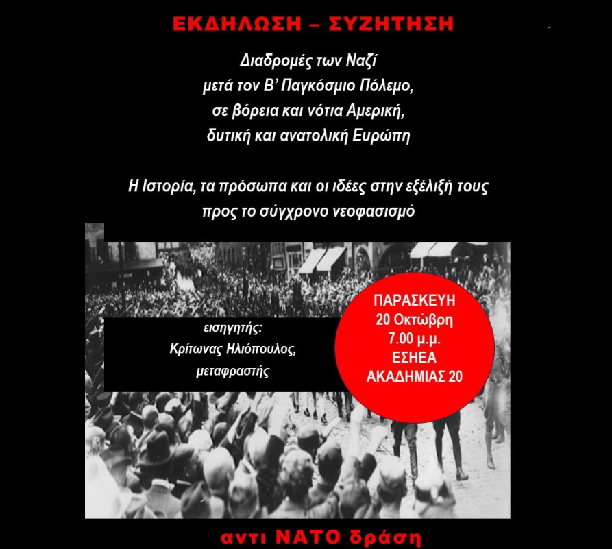 Eκδήλωση – Sυζήτηση με θέμα: «Διαδρομές των Ναζί μετά τον Β’ Παγκόσμιο Πόλεμο, σε βόρεια και νότια Αμερική, δυτική και ανατολική Ευρώπη. Η Ιστορία, τα πρόσωπα και οι ιδέες στην εξέλιξή τους προς το σύγχρονο νεοφασισμό».