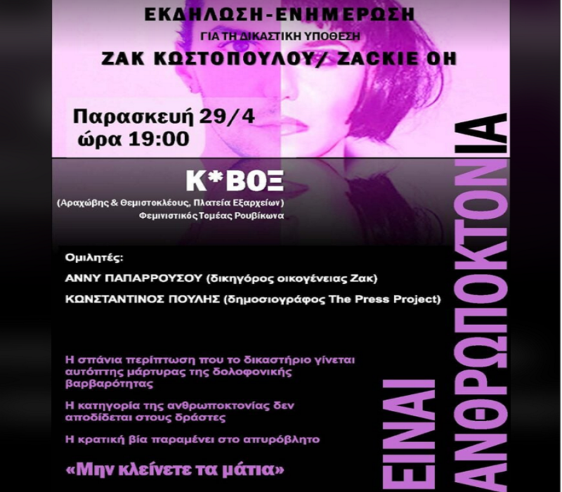Ο Φεμινιστικός Τομέας Ρουβίκωνα σας καλεί σε ενημερωτική εκδήλωση στην οποία η εκ των συνηγόρων της οικογένειας του Ζακ, Άννυ Παπαρρούσου και ο δημοσιογράφος του The Press Project, Κωνσταντίνος Πουλής, θα μας μεταφέρουν τα σημαντικά στοιχεία μιας εμβληματικής δίκης.