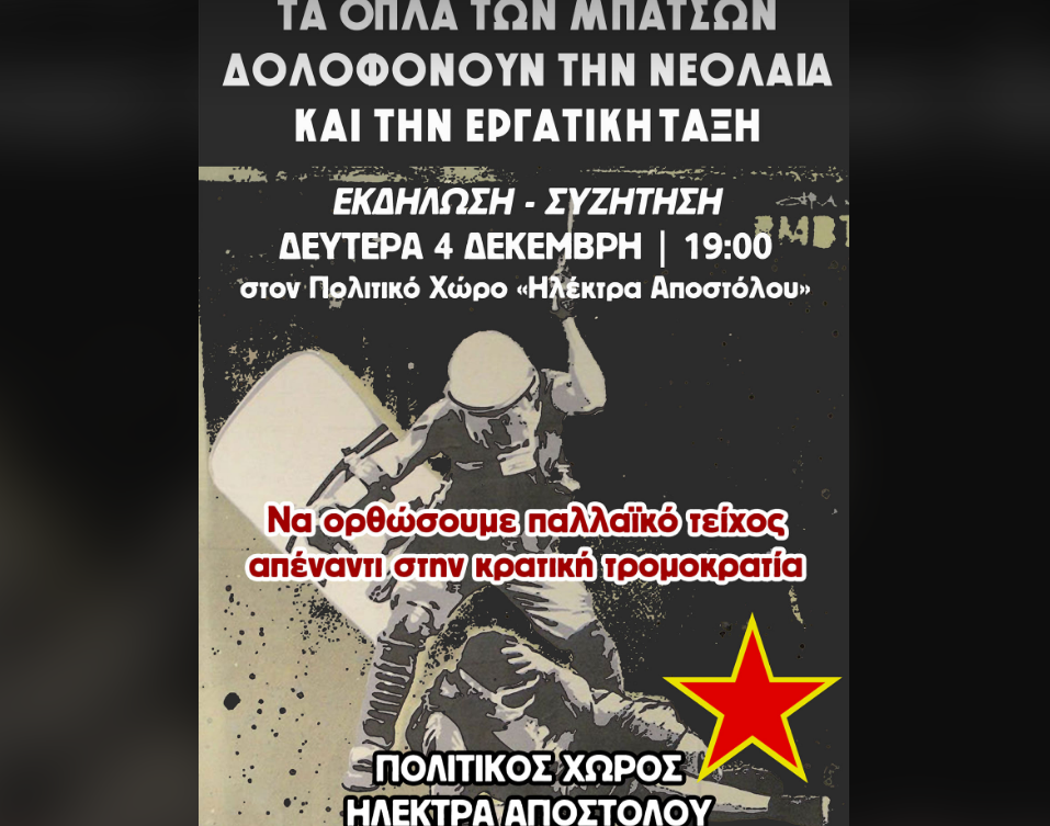 Δευτέρα 4 Δεκέμβρη στις 19:00 στον Πολιτικό Χώρο “Ηλέκτρα Αποστόλου”».