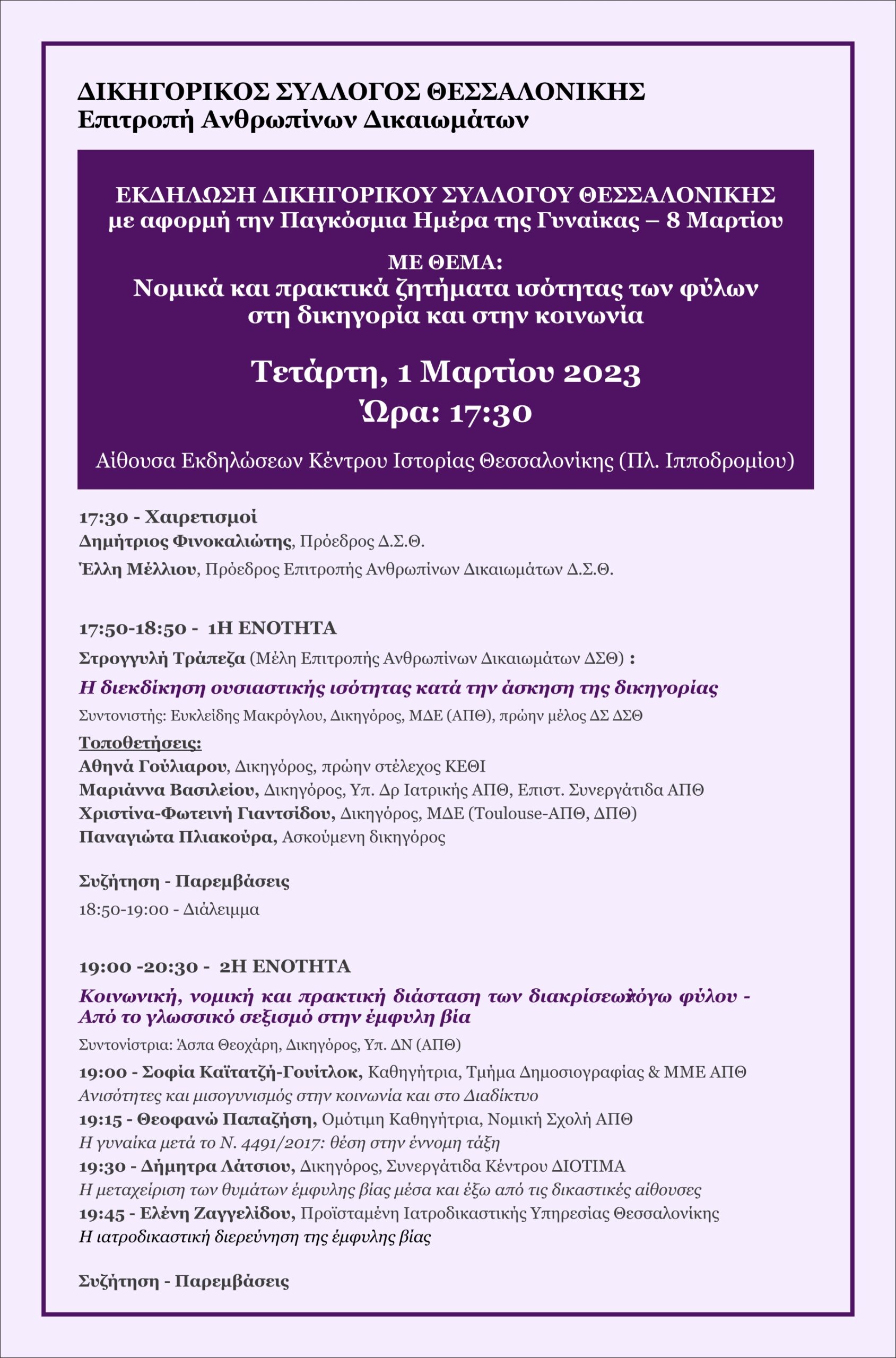 Το πρόγραμμα της εκδήλωσης δομήθηκε με όρους συμπεριληπτικότητας και με σκοπό η απεύθυνση να γίνει στο σύνολο της κοινωνίας και όχι αυστηρά στα μέλη της δικηγορικής κοινότητας. Στον 1ο κύκλο εισηγήσεων γυναίκες, οι οποίες εκπροσωπούν όλο το ηλικιακό και επαγγελματικό φάσμα της δικηγορικής διαδρομής, μας εκθέτουν την εμπειρία και το βίωμά τους, σκιαγραφώντας τα προβλήματα ανισότητας στην καθημερινή και επαγγελματική τους διάσταση, ενώ στον 2ο κύκλο, επιστημόνισσες από διαφορετικά ερευνητικά πεδία, θα μιλήσουν για την αντανάκλαση των διακρίσεων λόγω φύλου στην κοινωνική ζωή, από το γλωσσικό σεξισμό μέχρι την έμφυλη βία και τις αναρίθμητες γυναικοκτονίες.