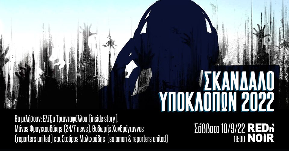 Οι δημοσιογράφοι Ελίζα Τριανταφύλλου (inside story), Μάνος Φραγκιουδάκης (news 24/7), Θοδωρής Χονδρόγιαννος (reporters united) και Σταύρος Μαλιχούδης (reporters united και solomon) μας μιλάνε το Σάββατο 10 Σεπτεμβρίου 2022 και ώρα 19:00 στο βιβλιοκαφέ red n’ noir (Δροσοπούλου 52, Κυψέλη), για το ιστορικό των ερευνών τους, τα εμπόδια που βρήκαν, τις προσπάθειες συγκάλυψης του σκανδάλου υποκλοπών 2022.