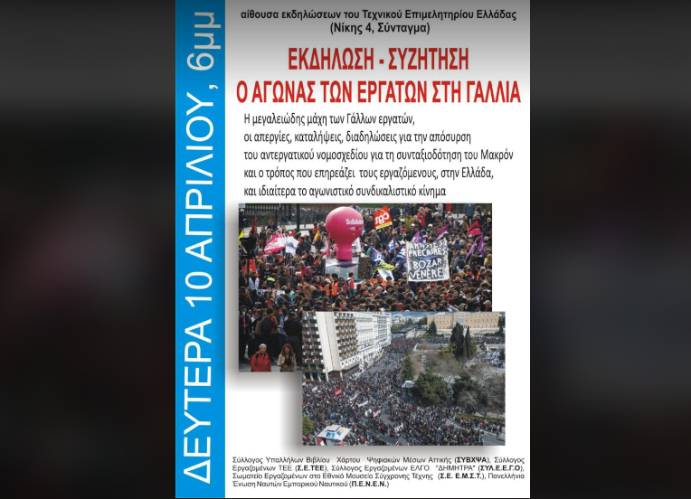 Πρόκειται για μια ταξική σύγκρουση η οποία έχει ξεπεράσει τα εθνικά όρια της Γαλλίας, αφορά όλους τους εργαζόμενους, και της δικής μας χώρας, και ιδιαίτερα το αγωνιστικό συνδικαλιστικό κίνημα.