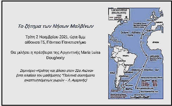 Εκδήλωση με θέμα «Το ζήτημα των Νήσων Μαλβίνων», διοργανώνεται την Τρίτη 2 Νοεμβρίου 2021 στις 8μμ, στο Πάντειο Πανεπιστήμιο.