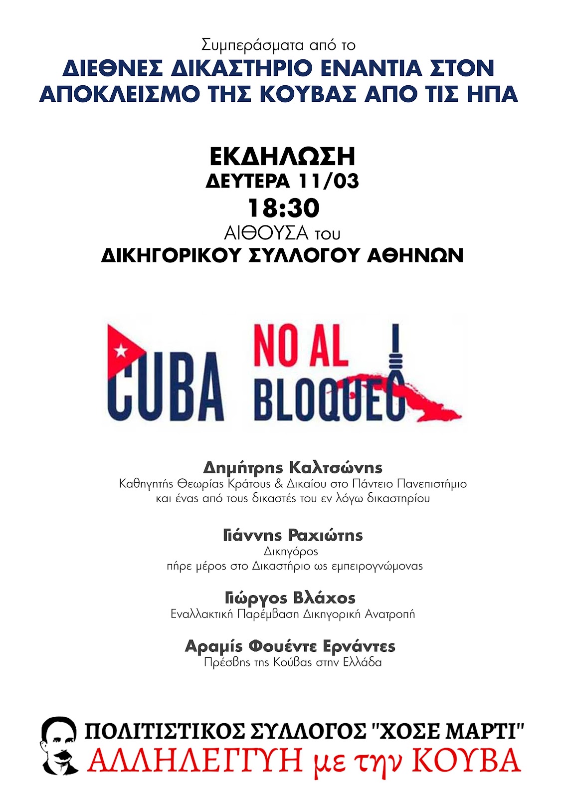Τη Δευτέρα 11 Μάρτη στις 6:30μμ στην αίθουσα του Δικηγορικού Συλλόγου Αθηνών (Ακαδημίας 60 ) θα πραγματοποιηθεί εκδήλωση-συζήτηση για την παρουσίαση των αποφάσεων και συμπερασμάτων του (άτυπου) Διεθνoύς Δικαστηρίου που συγκλήθηκε τον περασμένο Νοέμβρη στις Βρυξέλλες για να εξετάσει τον αποκλεισμό που επιβάλλουν οι ΗΠΑ ενάντια στην Κούβα εδώ και πάνω από 60 χρόνια.