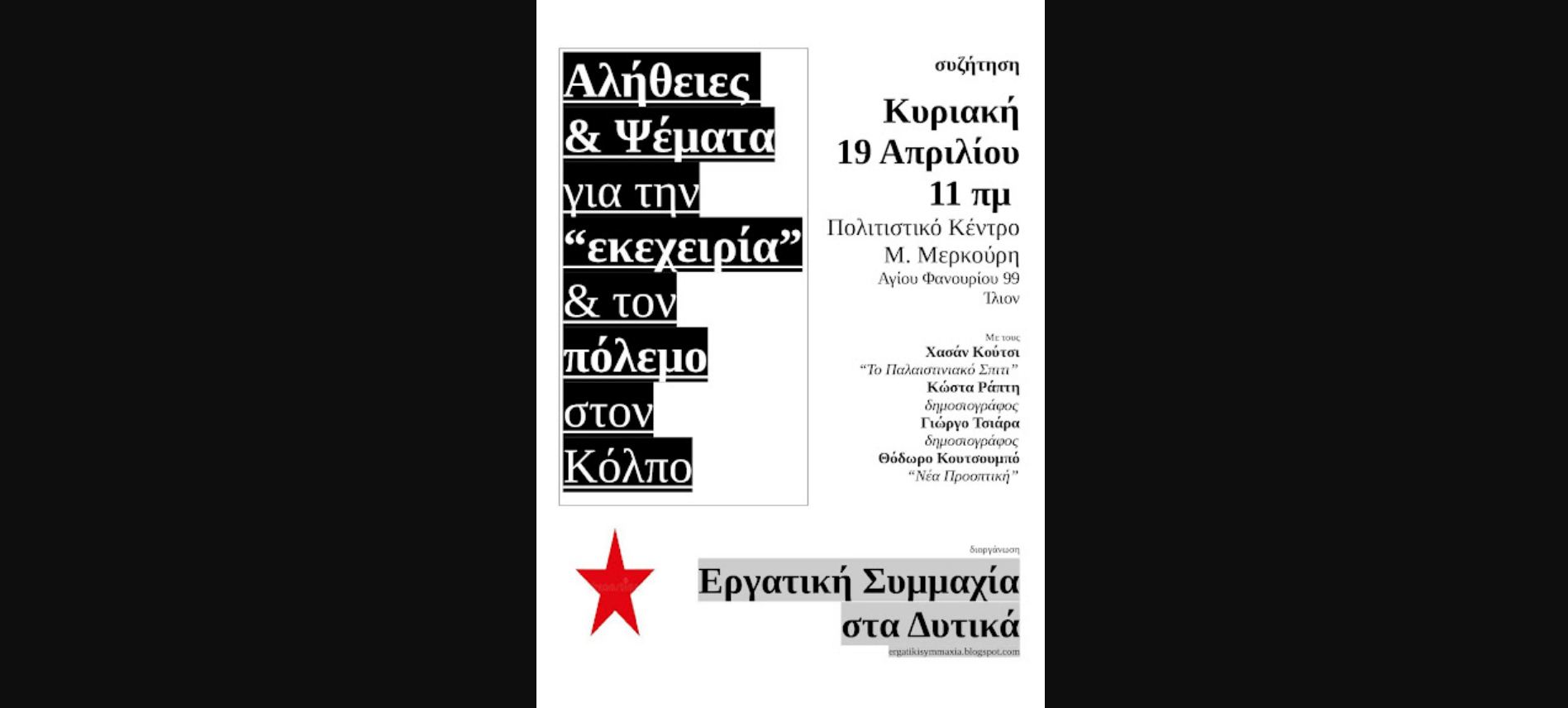Η Εργατική Συμμαχία στα Δυτικά διοργανώνει εκδήλωση-συζήτηση με τίτλο «Αλήθειες & Ψέματα για την "εκεχειρία" & τον πόλεμο στον Κόλπο», την Kυριακή 19 Απριλίου, 11 π.μ., στο Πολιτιστικό Κέντρο «Μ. Μερκούρη» (Αγίου Φανουρίου 99, Ίλιον).