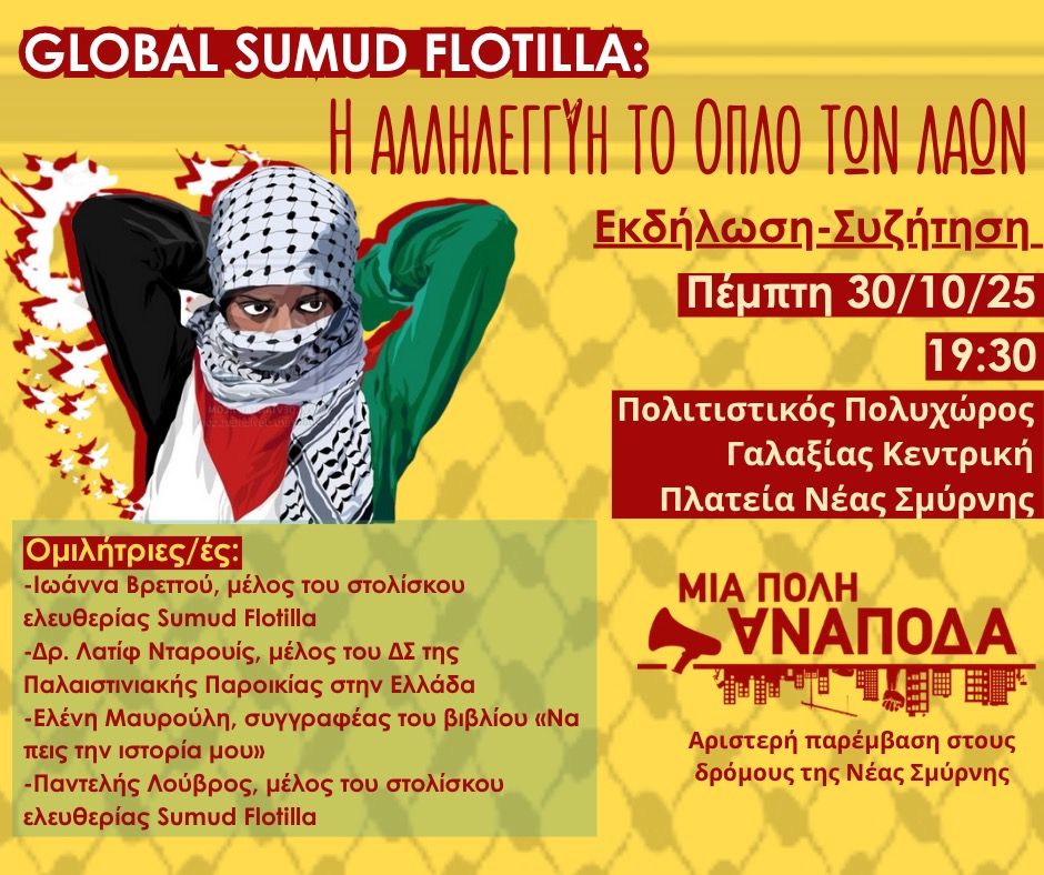 Απέναντι στη βαρβαρότητα, υπάρχουν εκείνοι που αντιστέκονται. Η Global Sumud Flotilla απέπλευσε με σκοπό να σπάσει τον αποκλεισμό της Γάζας και να μεταφέρει βοήθεια. Η απάντηση του Ισραήλ; Ένοπλη καταστολή σε διεθνή ύδατα, απαγωγές, βία. Η αποστολή όμως συνεχίζεται. Γιατί η αλληλεγγύη δεν φυλακίζεται.