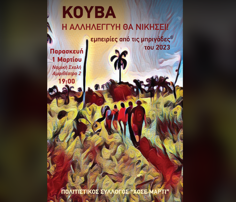 «Κουβα: Η αλληλεγγύη θα νικήσει» - Εμπειρίες από τις Μπριγάδες Αλληλεγγύης του 2023, την Παρασκευή 1/3 στις 19:00 στη Νομική Σχολή της Αθήνας (αμφιθέατρο 2).