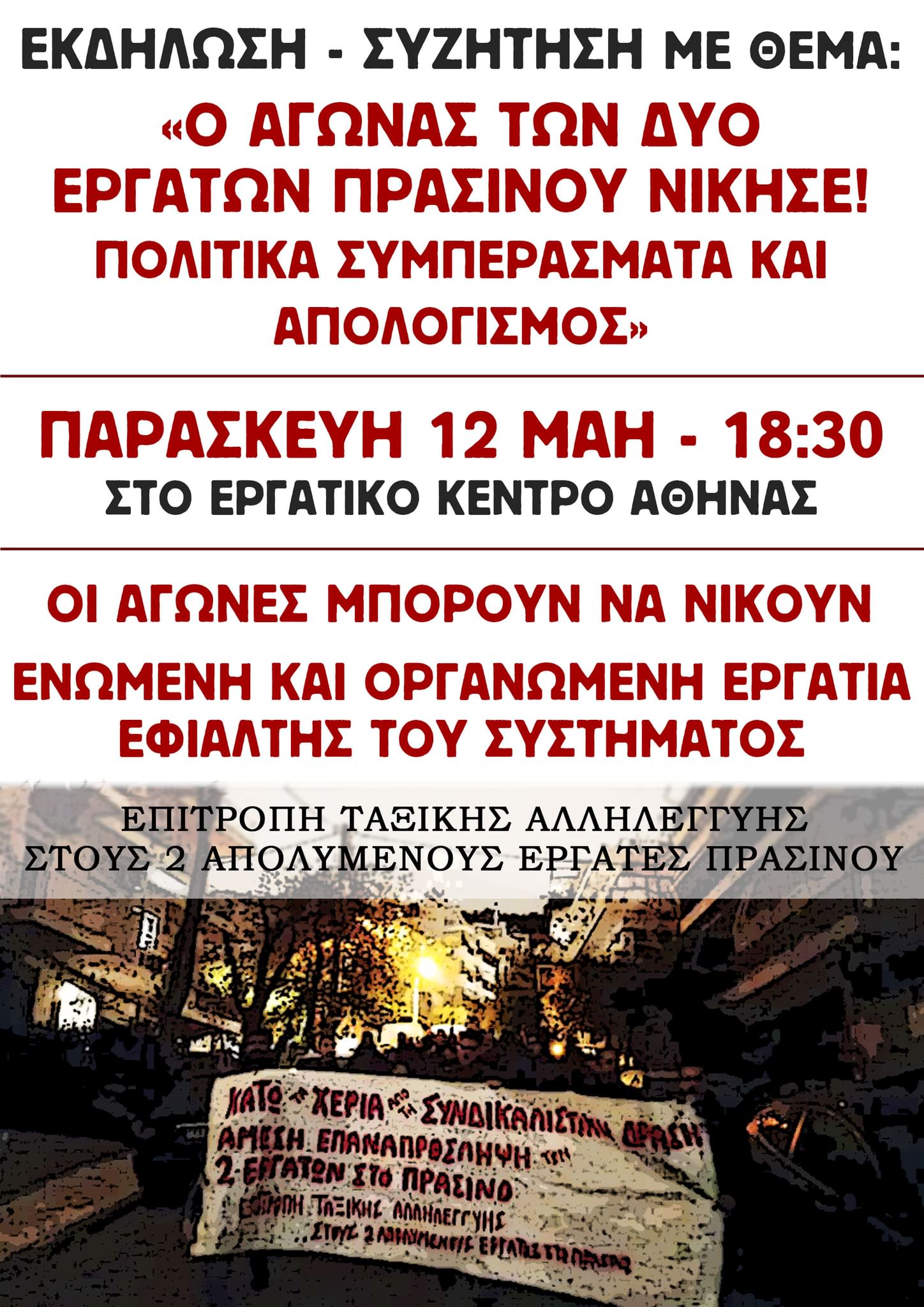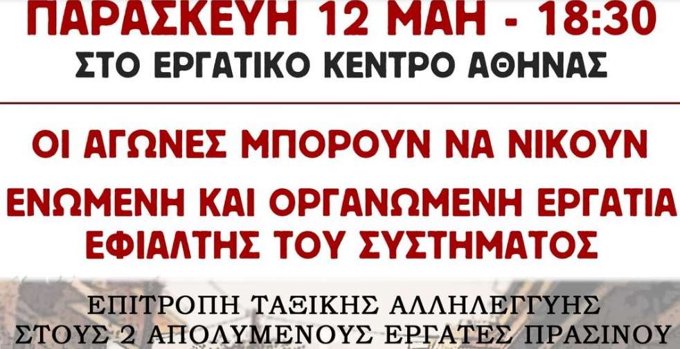 Η Επιτροπή Ταξικής Αλληλεγγύης στους 2 απολυμένους εργάτες πρασίνου διοργανώνει εκδήλωση - συζήτηση την Παρασκευή 12 Μάη στις 18:30, στο Εργατικό Κέντρο Αθήνας, με τίτλο «Ο αγώνας των 2 εργατών πρασίνου νίκησε- Πολιτικά Συμπεράσματα και Απολογισμός».