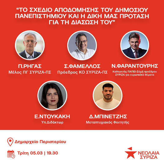 Η εκδήλωση θα πραγματοποιηθεί στο Δημαρχείο Περιστερίου, την Τρίτη 5 Μαρτίου, στις 19:30 με ομιλητές/τριες τον Πρόεδρο της ΚΟ του ΣΥΡΙΖΑ-ΠΣ, Σωκράτη Φάμελλο, το μέλος της ΠΓ του ΣΥΡΙΖΑ-ΠΣ, Πάνο Ρήγα, τον Καθηγητή του Πανεπιστημίου Πειραιώς, Νίκο Φαραντούρη, τον υπεύθυνο της Επιτροπής Παιδείας της Νεολαίας ΣΥΡΙΖΑ, Δήμο Μπινετζή και την Υπ. Διδάκτορα Ελένη Ντουκάκη.