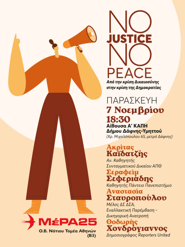 Η Οργάνωση Νότιου Τομέα Αθηνών (Β3) του ΜέΡΑ25 οργανώνει ανοιχτή εκδήλωση – συζήτηση με θέμα «Από την κρίση Δικαιοσύνης στην κρίση Δημοκρατίας». Την Παρασκευή 7 Νοεμβρίου, στις 6:30μ.μ., στην αίθουσα του Α’ ΚΑΠΗ Δήμου Δάφνης-Υμηττού (Χρ. Μιχαλόπουλου 65, μετρό Δάφνης).