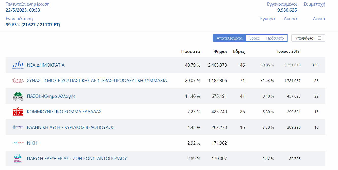 Με την ενσωμάτωση στο 60,61% η Ν.Δ. συγκεντρώνει συνολικά το 44,22%, ο ΣΥΡΙΖΑ 18,62%, το ΚΚΕ 10,56%, το ΜΕΡΑ25 10,25% και το ΠΑΣΟΚ 6,66%, καθώς το κόμμα της Κουμουνδούρου πήρε προβάδισμα 2,52% στην Ισπανία και 9,94% στην Σουηδία. Η Ν.Δ. προηγείται σε Ηνωμένο Βασίλειο, Γαλλία, Γερμανία, Ιταλία, Ελβετία, Ιρλανδία, Ουγγαρία, Νορβηγία, Πολωνία και Σαουδική Αραβία.