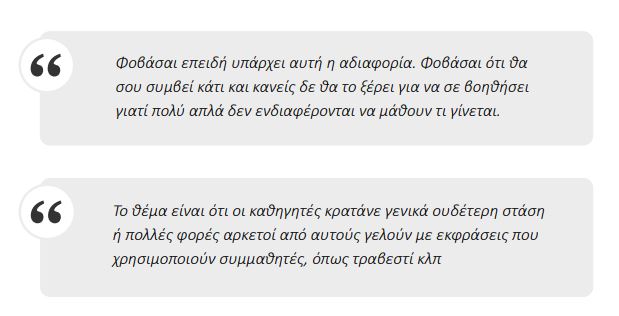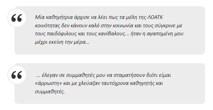 Αξίζει να αναφερθεί αυτό που είχε επισημάνει μιλώντας στο ThePressProject, η υπεύθυνη έργου της γραμμής 11528-ΔΙΠΛΑ ΣΟΥ, τη μοναδική γραμμή τηλεφωνικής στήριξης για ΛΟΑΤΚΙ, τους γονείς τους και τους εκπαιδευτικούς τους στην Ελλάδα, Κλεοπάτρα Οικονομίδου, πως δηλαδή το 9,8% από τα τηλεφωνήματα που δέχεται η γραμμή είναι ανήλικα παιδιά. «Έχει τύχει να μας καλούν ακόμα και μέσα από το σχολείο, την ώρα του διαλείμματος, γιατί αντιμετώπισαν bullying εκείνη την ώρα. Συνήθως, 8 στα 10 περιστατικά bullying που καταγράφονται στα σχολεία δεν είναι εκφοβισμός γενικώς κι αορίστως, αλλά έχει να κάνει με διακρίσεις λόγω φύλου. Το οποίο, βέβαια, δεν το κατονομάζουμε -λέμε bullying γενικά.»