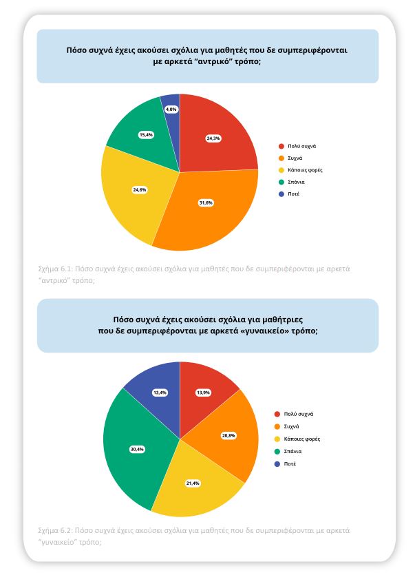 Το αντίστοιχο ποσοστό για άτομα που δε συμμορφώνονται στην αναμενόμενη «γυναικεία» συμπεριφορά είναι 86,6%. Περίπου ένα στα δύο άτομα που απάντησαν το ερωτηματολόγιο (51,1%) δηλώνει ότι έχει ακούσει αρνητικά σχόλια για την έκφραση φύλου από καθηγητές έστω και σπάνια. Το 74,4% των μαθητών και μαθητριών δηλώνει ότι ακούει τρανσφοβικά σχόλια έστω και σπάνια, ενώ το 18,3% δηλώνει ότι αυτά τα σχόλια γίνονται συχνά ή πολύ συχνά. Μόνο το 4,1% δηλώνει ότι δεν έχει ακούσει ποτέ ή ακούει σπάνια σεξιστικά σχόλια, με το 74,4% των ατόμων να δηλώνουν ότι ακούν πολύ συχνά κακοποιητικά σχόλια εναντίον των γυναικών.
