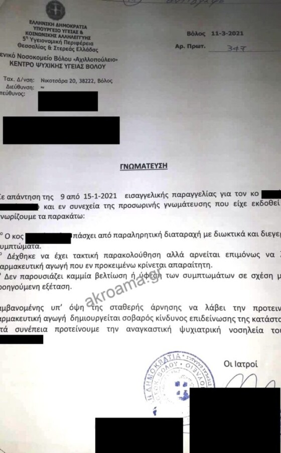 Υπενθυμίζεται ότι στις 15 Ιανουαρίου η 28χρονη είχε ζητήσει εισαγγελική παρέμβαση για ακούσια ψυχιατρική νοσηλεία του εν διαστάσει συζύγου της. Λίγες ημέρες αργότερα, ο 31χρονος εξετάστηκε από το Κέντρο Υγείας Βόλου όπου διαπιστώθηκε ότι πάσχει από ψυχιατρικό νόσημα. Σύμφωνα με έγγραφο που έφερε στη δημοσιότητα το akroama.gr, στις 11 Μαρτίου το Γενικό νοσοκομείου Βόλου προτείνει την «αναγκαστική ψυχιατρική νοσηλεία» του δράστη καθώς πάσχει από «παραληρητική διαταραχή με διωκτικά και διεγερτικά συμπτώματα, δεν δέχεται την φαρμακευτική αγωγή και δεν παρουσιάζει καμία βελτίωση ή και ύφεση των συμπτωμάτων».