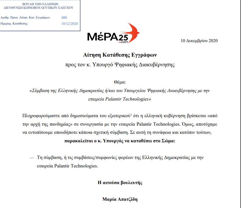 Την αρχή έκανε το ΜέΡΑ25, μέσω της βουλεύτριας του κόμματος Μαρίας Απατζίδη, η οποία στην αίτηση κατάθεσης εγγράφων αναφέρει ότι «πληροφορούμαστε από δημοσιεύματα του εξωτερικού ότι η ελληνική κυβέρνηση βρίσκεται “από την αρχή της πανδημίας” σε συνεργασία με την εταιρεία Palantir Technologies. Όμως, αποτύχαμε να εντοπίσουμε οπουδήποτε κάποια σχετική σύμβαση. Σε αυτή τη συνάφεια και κατόπιν τούτων, παρακαλείται ο κ. Υπουργός να καταθέσει στο Σώμα: Τη σύμβαση, ή τις συμβάσεις/συμφωνίες φορέων της Ελληνικής Δημοκρατίας με την εταιρεία Palantir Technologies».