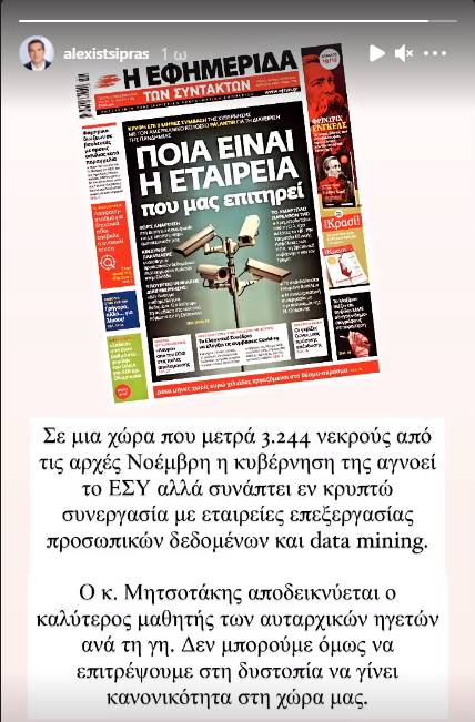 Σε ανάρτησή του στο instagram ο πρόεδρος της αξιωματικής αντιπολίτευσης, Αλέξης Τσίπρας, επισημαίνει ότι «σε μια χώρα που μετρά 3.244 νεκρούς από τις αρχές Νοέμβρη η κυβέρνησή της αγνοεί το ΕΣΥ αλλά συνάπτει εν κρυπτώ συνεργασία με εταιρείες επεξεργασίας προσωπικών δεδομένων και data mining».