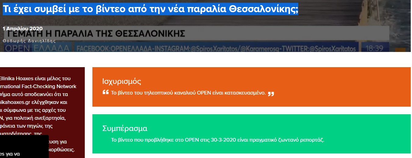 «Συμπέρασμα: Το βίντεο που προβλήθηκε στο OPEN στις 30-3-2020 ήταν πραγματικό ζωντανό (live) ρεπορτάζ. Η λήψη ζουμ δημιούργησε εικόνα πυκνότητας. Ο ισχυρισμός ότι το βίντεο είναι κατασκευασμένο είναι ψευδής.»