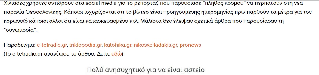 Στο ζήτημα που προέκυψε με τον «συνωστισμό» στη Νέα Παραλία της Θεσσαλονίκης και το «ρεπορτάζ» του OPEN, η ιστοσελίδα λοιπόν που έχει ως μόνο αντικείμενο τον έλεγχο των fake news, αποφάσισε να ασχοληθεί κυρίως με τις «αντιδράσεις των χρηστών» και μερικές ιστοσελίδες που έκαναν λόγο για μοντάζ και δευτερευόντως με την εικόνα που προέβαλε ο σταθμός και αναδημοσίευσαν δεκάδες άλλα ΜΜΕ, μολονότι σε μεγάλο μέρος του άρθρου αποδέχεται ότι οι ρυθμίσεις του φακού δημιούργησαν «εικόνα πυκνότητας» (sic). Την Τετάρτη λοιπόν, δημοσιεύτηκε ένα άρθρο που σκοπό έχει να εξηγήσει τι συνέβη με το επίμαχο «ρεπορτάζ» και τις μαζικές αντιδράσεις του διαδικτύου. Ο τίτλος είναι «Τι έχει συμβεί με το βίντεο από τη Νέα Παραλία Θεσσαλονίκης», επιλογή που ξενίζει κάπως, αν διαβάσει κανείς ολόκληρο το κείμενο. Το άρθρο εντάσσεται στην κατηγορία «συνωμοσιολογία» επίσης και όχι στην «παραπληροφόρηση». Είναι κι αυτό ζήτημα προτεραιοτήτων και επιλογών. Το χειρότερο όμως είναι ο «ισχυρισμός» και το «συμπέρασμα», στην αρχή του κειμένου: