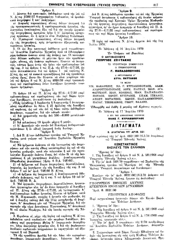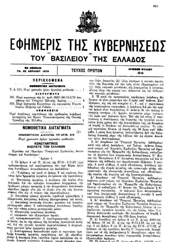 Η ΑΛΗΘΕΙΑ είναι πως όταν διάβασα το εξαιρετικό ρεπορτάζ του συναδέλφου Γεράσιμου Λιβιτσάνου σχετικά με το 10ωρο εργασίας που επισήμως έρχεται, ήξερα πως βρισκόμουν σε μια κατάσταση ντέζα βου. Βρε, σαν ποιο μοιάζει, σαν ποιο μοιάζει, αναρωτιόμουν. Κι, ξαφνικά, εγένετο φως: Έφερνε πολύ στο Ν.Δ. 515/70 (δημοσιευμένο σε ΦΕΚ, την 22α Απριλίου 1970 – Διονύσης Ελευθεράτος, Λαμόγια στο χακί , Εκδόσεις Τόπος, 2015, σ.227-229 – δείτε ολόκληρο στο τέλος του κειμένου). Το διάταγμα με το οποίο η Χούντα καταργούσε το οκτάωρο εργασίας σε μια σειρά επιχειρήσεων.