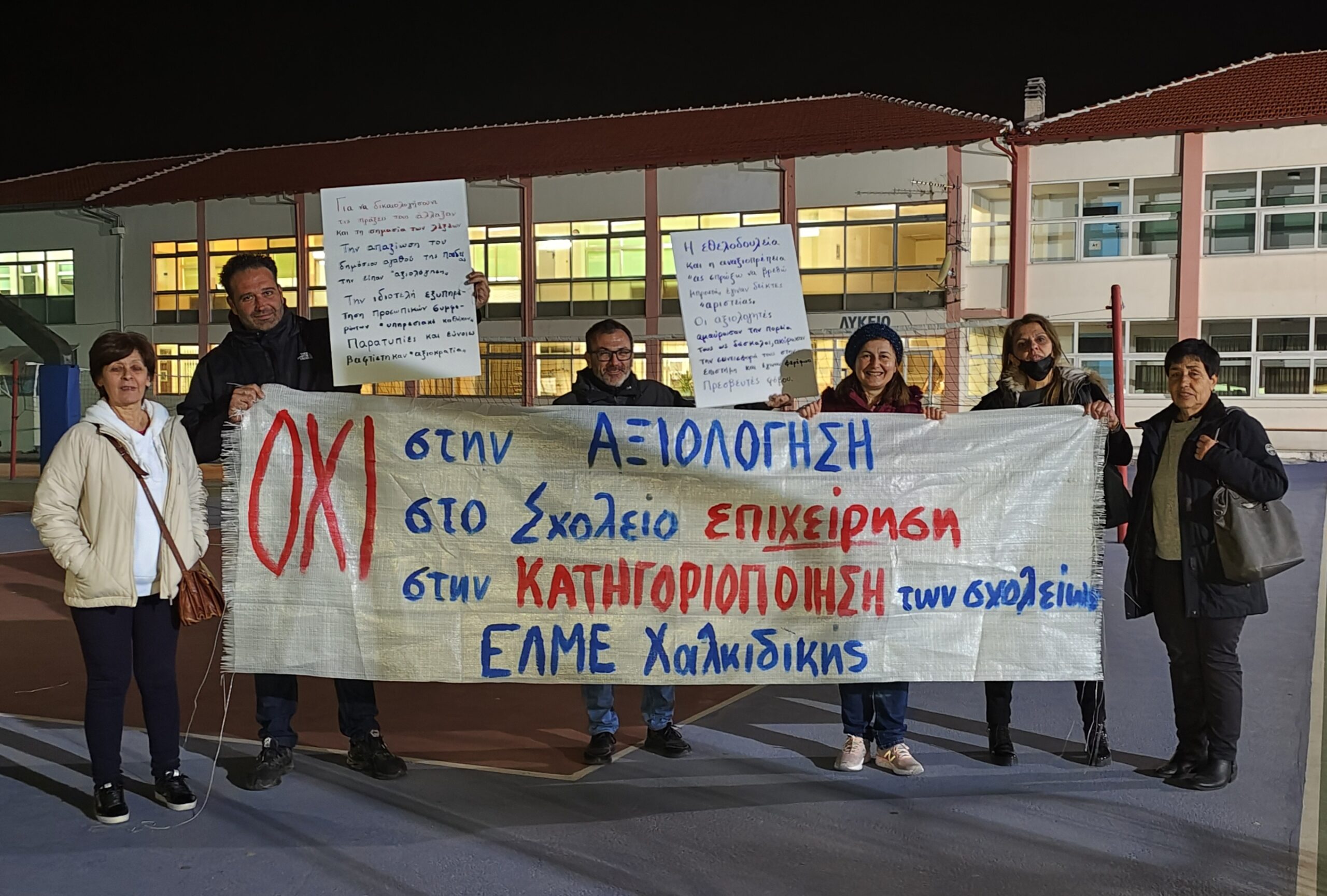 Η «πρώτη παρατήρηση» της εκπαιδευτικού από την αξιολογήτρια ορίστηκε στις 21:00 το βράδυ της Δευτέρας 20 Μαρτίου. Πέντε από τα επτά μέλη του ΔΣ της ΕΛΜΕ Χαλκιδικής και μέλη της επιτροπής αγώνα κατά της αξιολόγησης ήμασταν στο σχολείο από νωρίς, ενημερωθήκαμε λεπτομερώς για το παρασκήνιο της υπόθεσης και μόλις εμφανίστηκε η αξιολογήτρια προχωρήσαμε σε παράσταση διαμαρτυρίας. Στις εύλογες αιτιάσεις μας, την παράθεση της αλυσίδας των γεγονότων και την ανάδειξη των παρατυπιών, οι απαντήσεις που λάβαμε δεν ήταν παρά υπεκφυγές: «Δεν ήταν δική μου αρμοδιότητα οι τοποθετήσεις», «Το όνομα της αξιολογούμενης βρίσκεται στην πλατφόρμα και είναι υποχρέωσή μου να την αξιολογήσω», «ανέλαβα μια δουλειά και πρέπει να τη φέρω εις πέρας» κλπ. Ακόμη χειρότερα όταν επισημάναμε την ηθική πλευρά του ζητήματος και ζητήσαμε από την αξιολογήτρια να δώσει μια ξεκάθαρη απάντηση για το αν αποδέχεται την παραβίαση βασικών ηθικών αρχών και κάθε κανόνα δεοντολογίας, προκειμένου να «κάνει τη δουλειά της», ακόμη και με τη διεκπεραιωτική και μόνο σημασία του όρου, αντιμετωπίσαμε ένα τείχος ενοχλημένης σιωπής. Προφανώς δεν ήθελε μόνο η αξιολογούμενη διακαώς να αξιολογηθεί αλλά και η αξιολογήτρια «διακαώς» να αξιολογήσει.