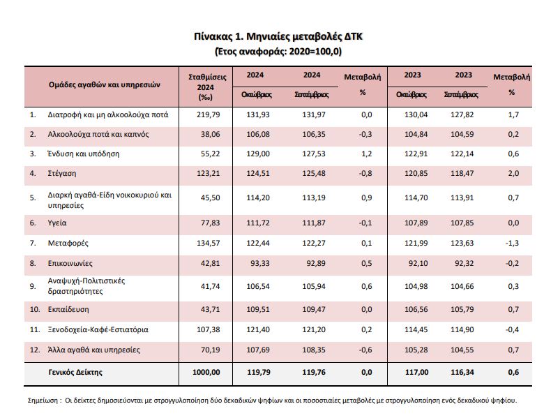 Η μηδενική μεταβολή του Γενικού ΔΤΚ τον μήνα Οκτώβριο 2024, σε σύγκριση με τον αντίστοιχο Δείκτη του Σεπτεμβρίου 2024, προήλθε κυρίως από τις μεταβολές στις ακόλουθες ομάδες αγαθών και υπηρεσιών: