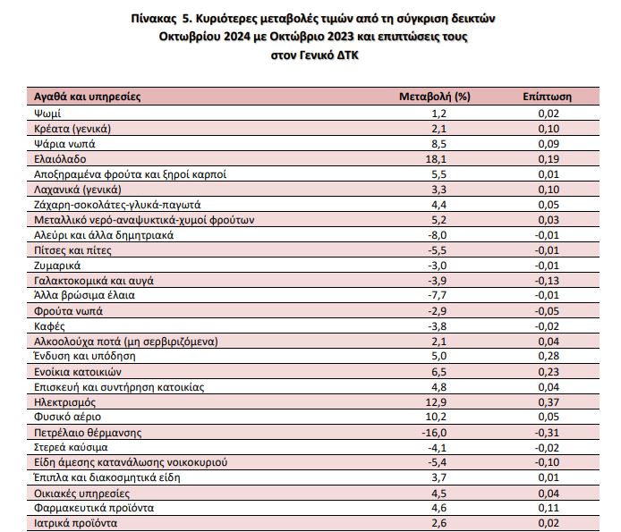 Σύμφωνα με τα στοιχεία, από τον Οκτώβριο 2023 το ελαιόλαδο είναι ανατιμήθηκε κατά 18,1%, τα ψάρια 8,5%, αλλά καταγράφεται μείωση τιμών 8% στο αλεύρι. Σημαντική είναι και η αύξηση στο ρεύμα, το οποίο είναι ακριβότερο κατά 12,9%, ενώ το φυσικό αέριο κατά 10,2%. Μεγάλες είναι οι ανατιμήσεις στα αεροπορικά εισιτήρια με 25,6% και 16,9% στα ξενοδοχεία. Ανατιμήσεις 14% καταγράφονται στα ασφάλιστρα υγείας.