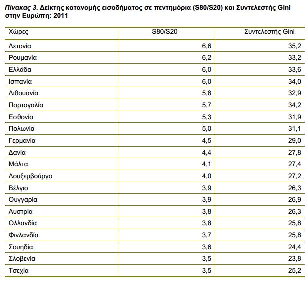 Τέλος, σύμφωνα με το δείκτη κατανομής εισοδήματος (S80/S20) «πρωταθλήτρια» οικονομικής ανισότητας είναι η Ισπανία (7,2) με την Ελλάδα (6,6) να ακολουθεί στη δεύτερη θέση μεταξύ των εξεταζόμενων ευρωπαϊκών χωρών. Η Νορβηγία διατηρεί και εδώ την πρωτιά της ως χώρα με την πιο περιορισμένη εισοδηματική ανισότητα (3,2).