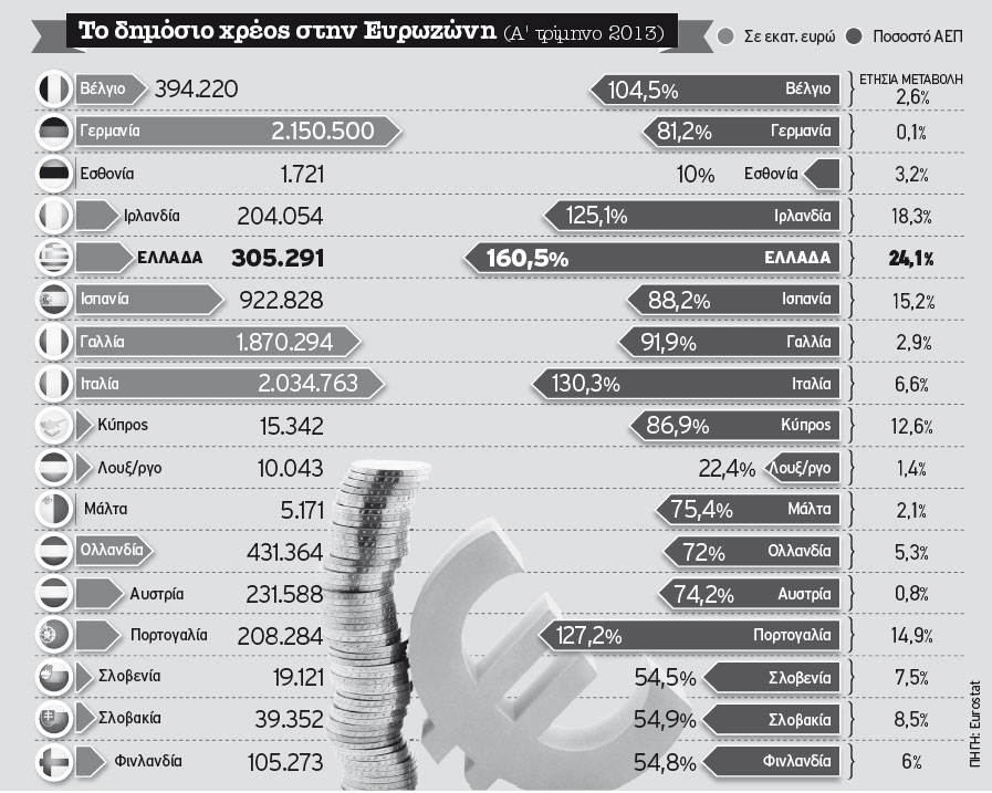 Ο υψηλότερος στην ευρωζώνη παραμένει ο λόγος δημοσίου χρέους-ΑΕΠ της Ελλάδας, παρά την πρωτόγνωρη σε έκταση δημοσιονομική προσαρμογή που έχει συντελεσθεί τα τρία τελευταία έτη.