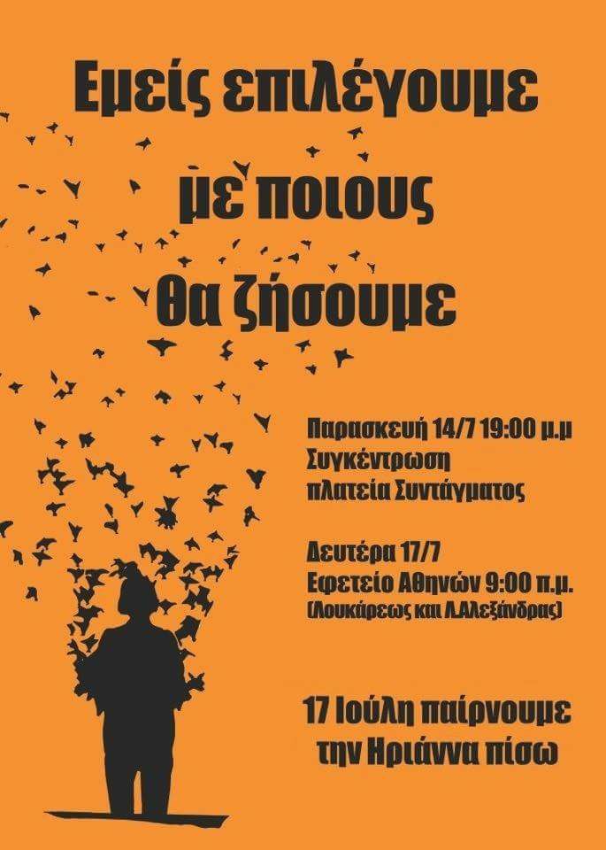 «Όλες και όλοι δίνουμε το “παρών” την Παρασκευή 14/07 στις 19.00 στην πλατεία Συντάγματος για να αποδείξουμε ότι η Ηριάννα Β.Λ δεν είναι μόνη της και να δηλώσουμε έμπρακτα τη στήριξή μας. Για να ζητήσουμε την άμεση καθαρογραφή της απόφασης και την αποκατάσταση της αδικίας» αναφέρεται στο σχετικό κάλεσμα στα social media.