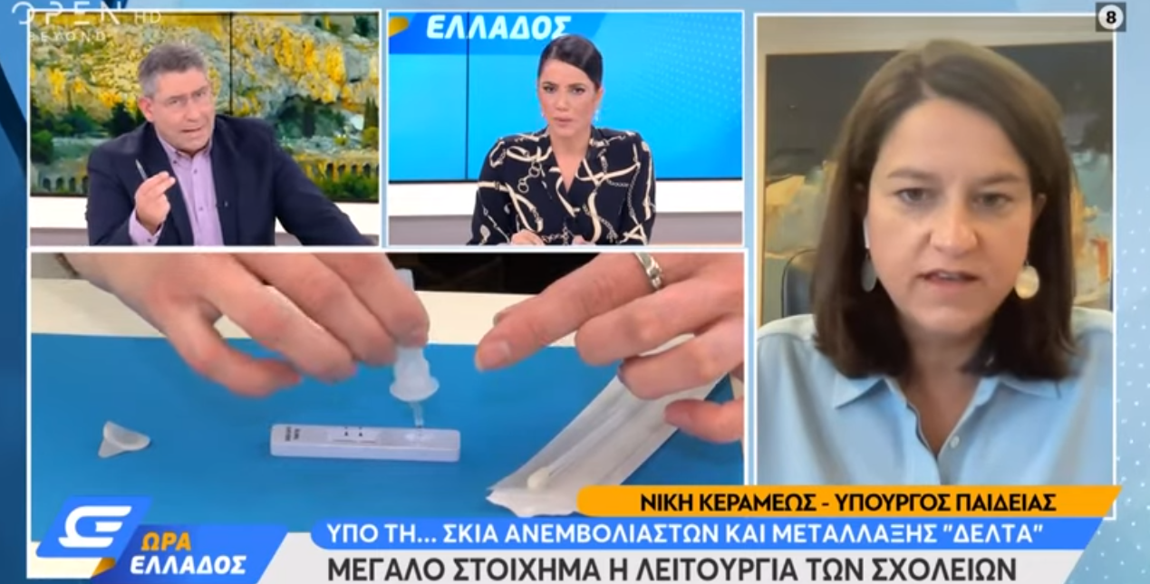 Η ίδια σημείωσε ότι τα ποσοστά εμβολιασμένων στους εκπαιδευτικούς είναι αρκετά υψηλά και εξήγησε ότι «κανείς δεν θα μπαίνει σε τάξη χωρίς κάλυψη», υπενθυμίζοντας ότι οι ανεμβολίαστοι εκπαιδευτικοί θα πρέπει να κάνουν δύο εργαστηριακά τεστ την εβδομάδα με δική τους ευθύνη και κόστος που θα επιβαρύνει τους ίδιους. Η υπουργός Παιδείας εξήγησε ότι τα πρωτόκολλα για τις περιπτώσεις κρουσμάτων σε σχολική αίθουσα ακολουθούν τη διεθνή τάση σημειώνοντας ότι «σε περίπτωση κρούσματος όλο το τμήμα θα κάνει δύο rapid test δωρεάν από το κράτος ενώ τα παιδιά που θα είναι πιο κοντά στο κρούσμα θα κάνουν σχεδόν κάθε ημέρα τεστ ενώ οι εμβολιασμένοι μαθητές θα κάνουν self test».