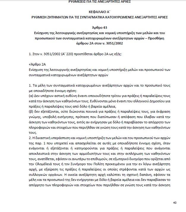Η διάταξη, η οποία περιλαμβάνεται σε πολυνομοσχέδιο, που ολοκληρώνει το νομοθετικό έργο της παρούσας Βουλής, «φωτογραφίζει» τα μέλη της ΑΔΑΕ και τον Χρήστο Ράμμο, ενώ δεν ήταν αναρτημένη στη διαβούλευση. Ολόκληρη η διάταξη του άρθρου 43 αναφέρει: «ευθύνονται μόνο έναντι του ελληνικού Δημοσίου για πράξεις ή παραλείψεις τους από δόλο ή βαρεία αμέλεια, (β) δεν εξετάζονται, ούτε διώκονται ποινικά για πράξεις ή παραλείψεις τους, για έκφραση γνώμης, υποβολή εισήγησης, πρόταση που διατύπωσαν ή απόφαση που έλαβαν κατά την άσκηση των καθηκόντων τους, εκτός αν ενήργησαν με δόλο ή παραβίασαν το απόρρητο των πληροφοριών και στοιχείων που περιήλθαν σε γνώση τους κατά την άσκηση των καθηκόντων τους».