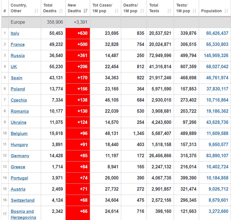 Η πραγματική εικόνα λοιπόν, την ώρα που ο υπουργός πανηγύριζε «σε εισαγωγικά, γιατί είμαστε 12 φορές καλύτερα από το Βέλγιο» φωνάζοντας στις τηλεοράσεις μας, έλεγε πως μέσα σε ένα Σαββατοκύριακο, η χώρα θρήνησε 211 ανθρώπους. Συγκρίνοντας τις απώλειες αυτές με των υπολοίπων ευρωπαϊκών χωρών, προκύπτει πως το Σάββατο, η Ελλάδα βρισκόταν στην 11η θέση με 108 νεκρούς, μόλις δεκατρείς λιγότερoυς από τη Γερμανία, σε απόλυτους αριθμούς, και αρκετές, όπως η Πορτογαλία και η Αυστρία πληθυσμού αντίστοιχου αριθμητικά με τον δικό μας, να έπονται. Ίδια εικόνα και την Κυριακή, με 103 απώλειες έναντι των 104 της Γερμανίας, των 84 εκατομμυρίων κατοίκων. Δείτε τη σημερινή εικόνα, που φέρνει τη χώρα μας στην 13η θέση των απωλειών, με τη Γερμανία να έχει και πάλι μόλις μία απώλεια παραπάνω σε απόλυτους αριθμούς και ανεξαρτήτως πληθυσμού, και το Βέλγιο δεκατέσσερις, και σίγουρα, όχι δώδεκα φορές χειρότερα (πηγή: Wordlmetersinfo):