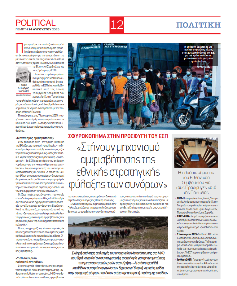 Η διαρροή πηγών του Υπουργείου Μετανάστευσης (βλ. δημοσίευμα Γ. Σκορδίλη στην εφημερίδα Political, 14/8/2025) για την αίτηση ακύρωσης που κατέθεσε στο Διοικητικό Πρωτοδικείο Αθηνών το Ελληνικό Συμβούλιο για τους Πρόσφυγες (ΕΣΠ) για λογαριασμό Σουδανών προσφύγων που κρατούνται στην Αμυγδαλέζα, κατά της τρίμηνης αναστολής υποβολής αιτημάτων ασύλου, αποτελεί την επιτομή του ολοκληρωτισμού.