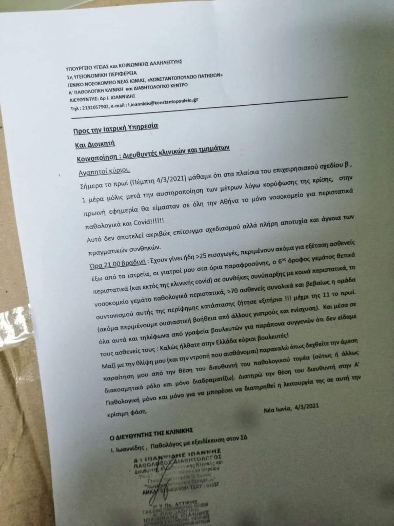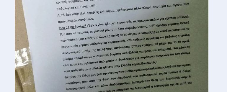 Όπως διευκρινίζει περιγράφοντας τις συνθήκες τον τελευταίο καιρό στο νοσοκομείο ζητά να γίνει άμεσα δεκτή η παραίτηση του από τη θέση του διευθυντή του Παθολογικού Τομέα και διατηρεί τη θέση του Διευθυντή στην Α’ Παθολογική «μόνο και μόνο για να μπορέσει να διατηρηθεί η λειτουργία της σε αυτή την κρίσιμη φάση».