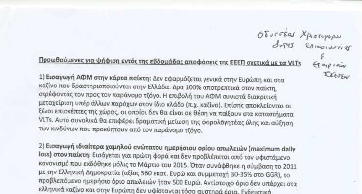 Σύμφωνα με το ΜέΡΑ25, «ο κ. Κατρακάζης, μέλος της επιτροπής και εκλεκτός του κ.Δραγασάκη, εμφανίζεται στην Επιτροπή και παραδίδει στον Πρόεδρό της, τον κύριο Στεργιώτη, ένα έγγραφο από τον ΟΠΑΠ, με το όνομα του αποστολέα χειρόγραφα γραμμένο πάνω, τον Διευθυντή Επικοινωνίας και Εταιρικών Σχέσεων του ΟΠΑΠ, κύριο Χριστοφόρου. Με το έγγραφο αυτό ο ΟΠΑΠ ζητά από τον Πρόεδρο και την Επιτροπή να μην προχωρήσουν σε καμία από τις αλλαγές που έχουν αποφασίσει για τον Κανονισμό Λειτουργίας Παιγνιομηχανημάτων, ώστε να μην πληγούν τα κέρδη του ΟΠΑΠ.