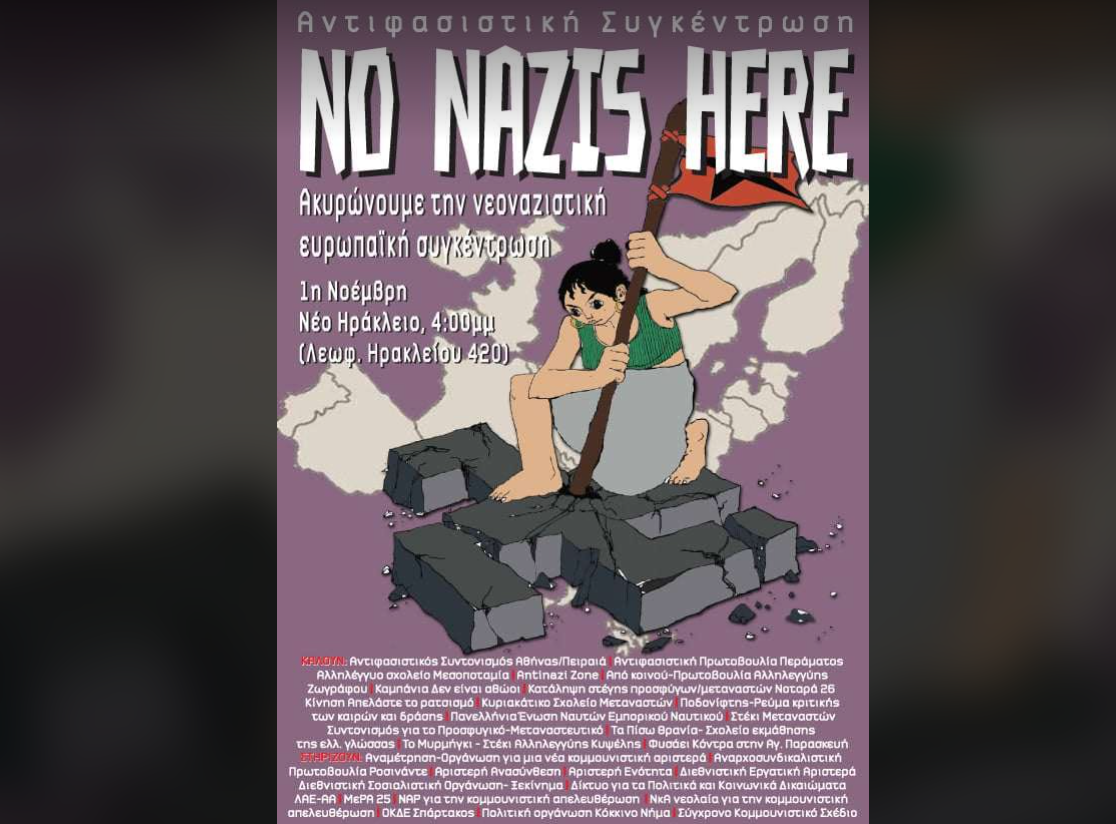 Ο Αντιφασιστικός Συντονισμός Αθήνας – Πειραιά οργανώνει συνέντευξη τύπου προκειμένου να ενημερώσει σχετικά με την ευρωπαϊκή φασιστική συγκέντρωση που νεοναζιστικές ομάδες επιχειρούν για την 1η του Νοέμβρη στο Ν. Ηράκλειο και την απάντηση που οργανώνει το αντιφασιστικό κίνημα.