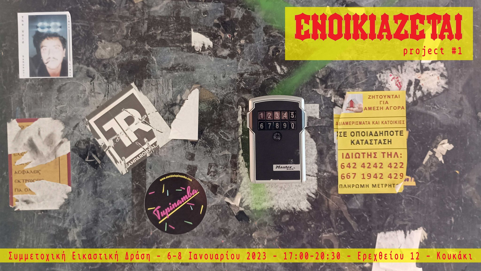 Η Συμμετοχική Εικαστική Δράση ΕΝΟΙΚΙΑΖΕΤΑΙ project#1, θα πραγματοποιηθεί σε ισόγειο κατάστημα επί της οδού Ερεχθείου 12 στο Κουκάκι, το τριήμερο 6, 7 και 8 Ιανουαρίου 2023.