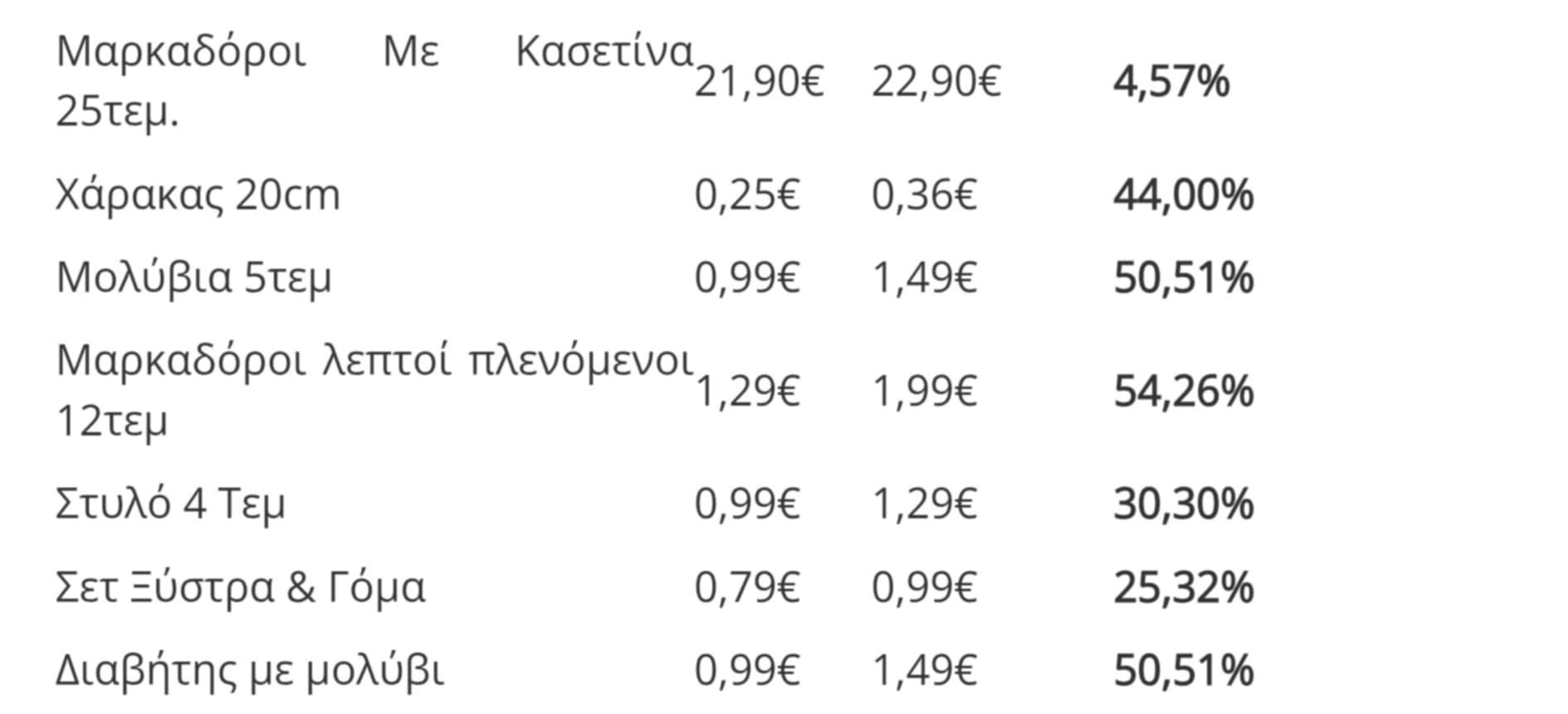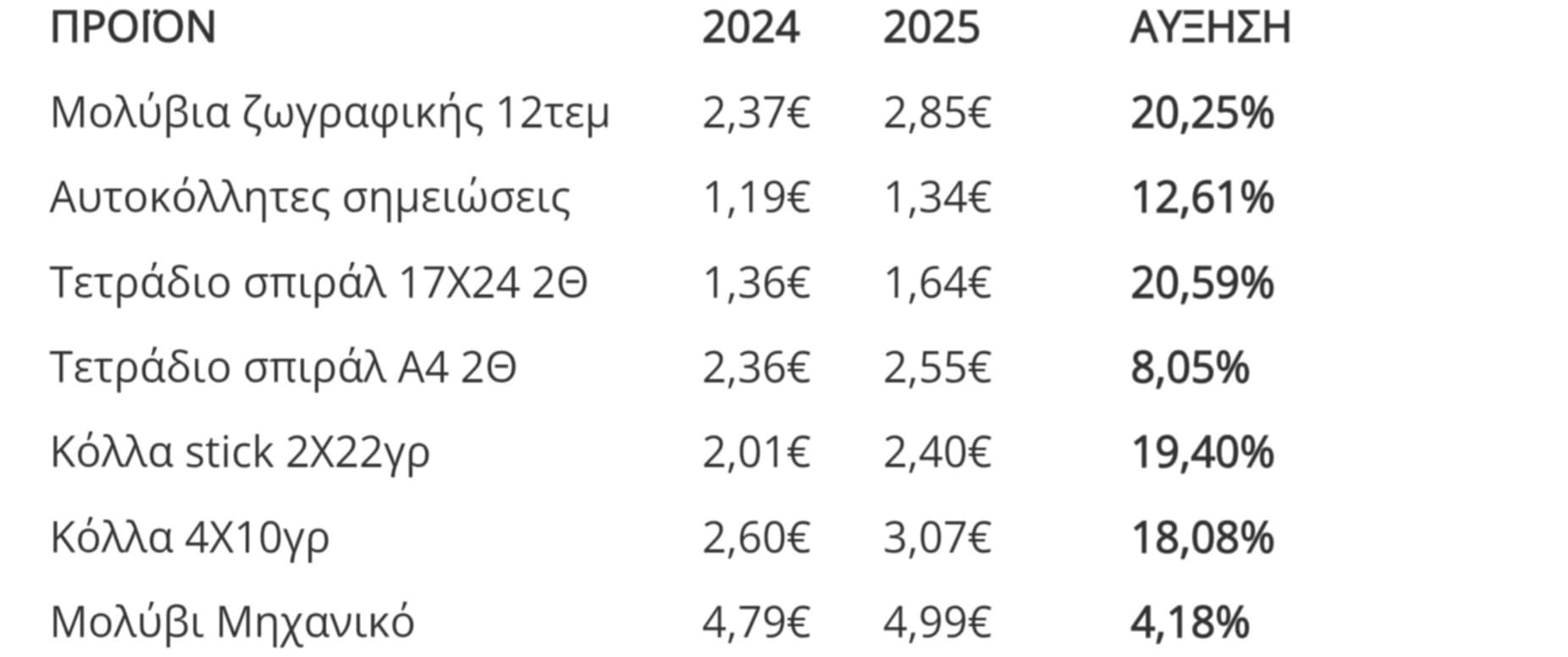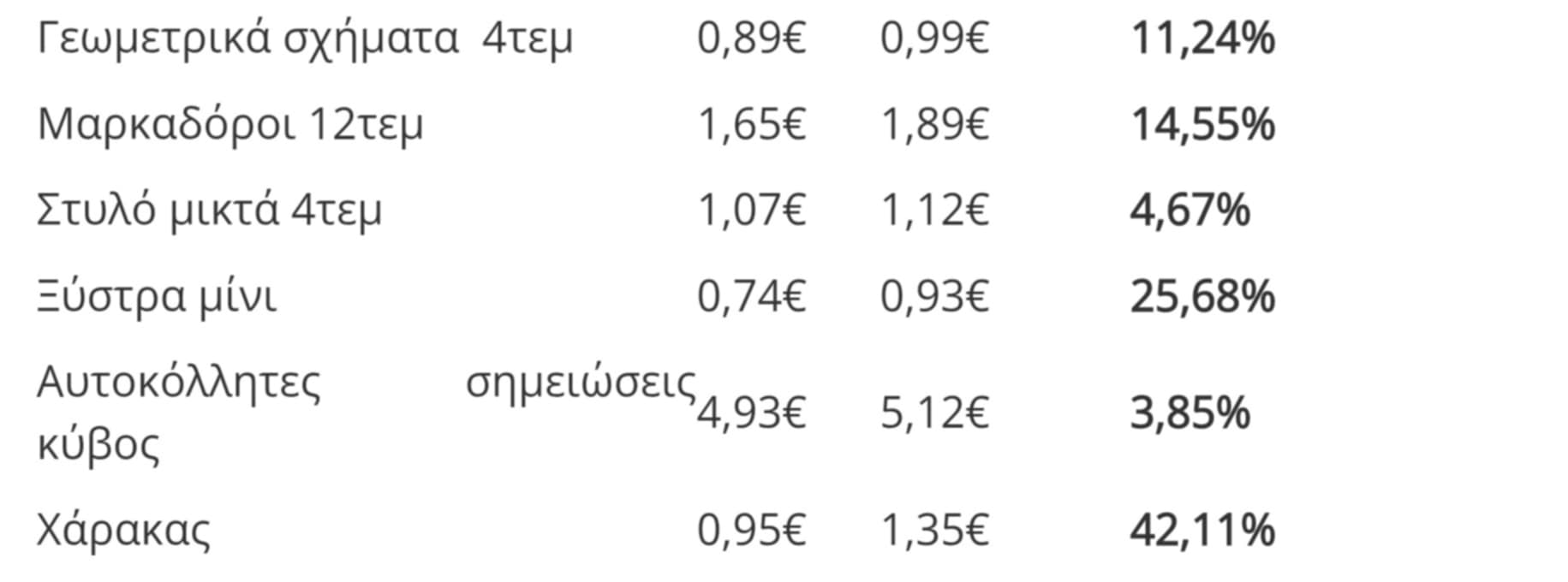 Ακολουθεί ο πίνακας με τις αυξήσεις των σχολικών ειδών: