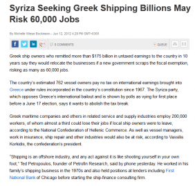 Οι Έλληνες πλοιοκτήτες, που μέχρι σήμερα δεν πληρώνουν φορολογία, ευνοημένοι από άρθρο του Συντάγματος που έχει τεθεί σε ισχύ το 1967, θα μεταφέρουν τις επιχειρηματικές τους δραστηριότητες αλλού σε περίπτωση που αλλάξει το φορολογικό καθεστώς, ρισκάροντας 60.000 θέσεις εργασίας, λέει το δημοσίευμα.