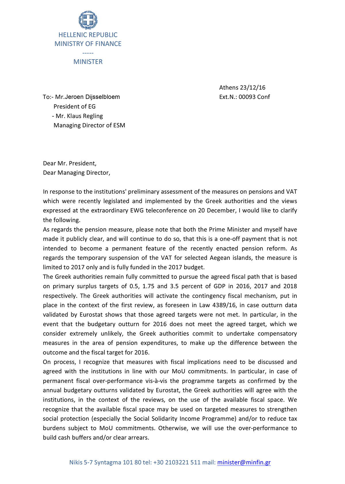 Η επιστολή Τσακαλώτου είναι στην πραγματικότητα ένα έγγραφο που είχε προαποφασιστεί να διαρρεύσει και για αυτό και ζητήθηκε από την κυβέρνηση. Ο Αλέξης Τσίπρας είχε διαβεβαιώσει δημόσια τους ανησυχούντες εκπροσώπους της Τρόικας ότι το έξτρα βοήθημα προς τους συνταξιούχους και η αναβολή της αύξησης του ΦΠΑ στα νησιά ήταν εφάπαξ και αφορούσε μόνο το 2016. Ακόμα είχε αναφερθεί στον νομοθετημένο δημοσιονομικό κόφτη και είχε δεσμευτεί ότι «στην απίθανη περίπτωση που τα στοιχεία της Eurostat δεν δείξουν πλεόνασμα τουλάχιστον 0,5% θα ενεργοποιηθεί». Με άλλα λόγια οι διαβεβαιώσεις που υποτίθεται ότι ήθελε η Τρόικα είχαν ήδη δοθεί.