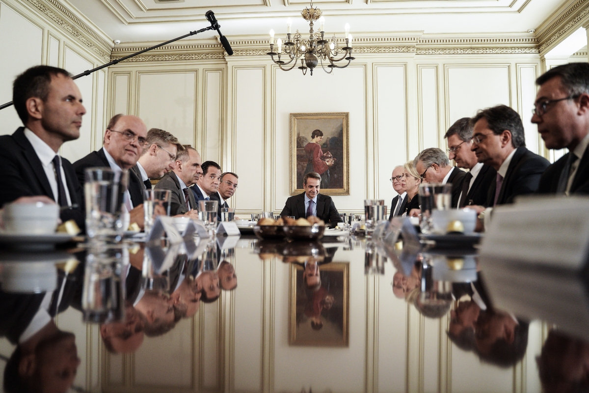 Aπό την πλευρά της κυβέρνησης, στη συνάντηση συμμετείχαν επίσης ο υπουργός Οικονομικών Χρήστος Σταϊκούρας, ο υπουργός Ανάπτυξης και Επενδύσεων ‘Αδωνις Γεωργιάδης, ο υπουργός Επικρατείας Γιώργος Γεραπετρίτης, ο υφυπουργός Οικονομικών, αρμόδιος για το χρηματοπιστωτικό σύστημα, Γιώργος Ζαββός, ο υφυπουργός παρά τω πρωθυπουργώ, αρμόδιος για τον Συντονισμό του Κυβερνητικού Έργου, ‘Ακης Σκέρτσος, η γενική γραμματέας Συντονισμού Οικονομικών και Αναπτυξιακών Πολιτικών Βίκυ Λοΐζου, ο γενικός γραμματέας Συντονισμού Εσωτερικών Πολιτικών Θανάσης Κοντογεώργης, ο γενικός γραμματέας Διαχείρισης Ιδιωτικού Χρέους Φώτης Κουρμούσης και ο επικεφαλής του Οικονομικού Γραφείου του Πρωθυπουργού Αλέξης Πατέλης.
