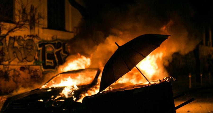 Στην οδό Στουρνάρη, έξω από το Πολυτεχνείο, κουκουλοφόροι έβαλαν φωτιά σε κάδους απορριμμάτων και πυρπόλησαν οχήματα.