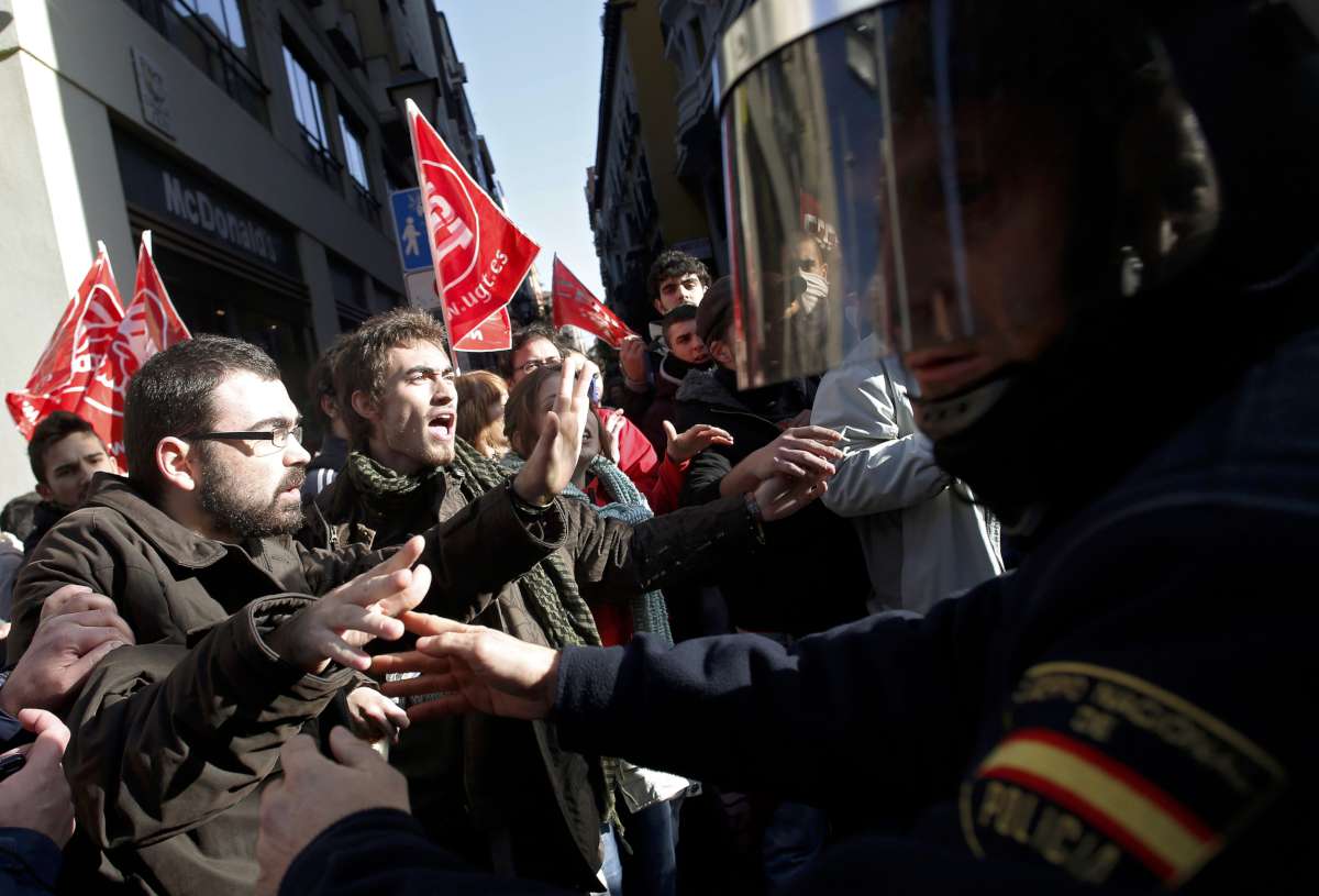 Πλαστικές σφαίρες και κλομπ χρησιμοποίησε η ισπανική αστυνομία κατά των διαδηλωτών στην πλατεία Σιμπέλες, στην κεντρική Μαδρίτη, καθώς εκατομμύρια εργαζόμενοι κατεβαίνουν σε διαμαρτυρίες κατά των μέτρων λιτότητας σε όλη την Ευρώπη